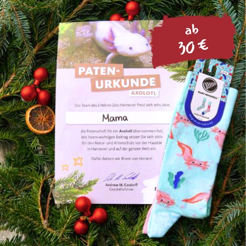 - Patenschaft mit Patenurkunde und Axolotl-Socken (inkl. 2,90 € Versandkosten)
